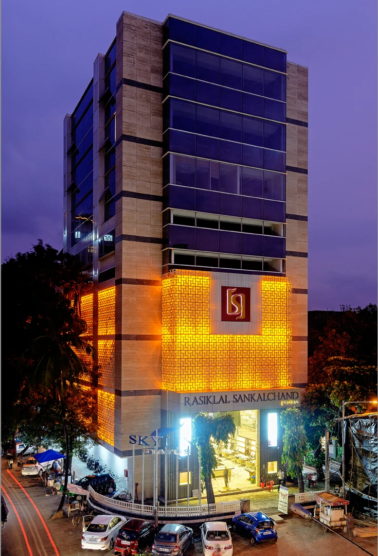 This building is located in the bustling business district area in the suburb of Ghatkopar in Mumbai. The first two floors are dedicated to a retail jewelry store, while the floor above that is dedicated to parking. Rest of the floors above parking are office spaces.